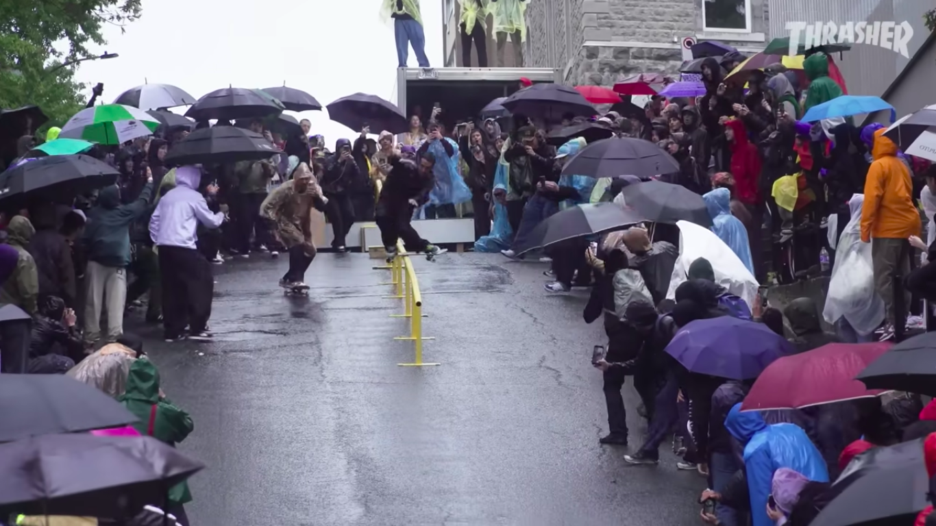Still, skating has a long history with rain, and that afternoon, I was reminded how some of its most mythical tricks were done when the sky came down. Pedro Delfino 50-50’d the flat bar first try, a trick that barely registered against the collective struggle everyone else seemed to have. Mostly, competitors eschewed the flat bar, and chucked flip tricks off the platform at the top instead. Hill bombs ensued. Hometown hero Léon Chapdelaine even added some theatrics by turning switch half way down Avenue Hotel-de-Ville. Generally, though, caution prevailed, as everyone who made it to the bottom of the hill faced the same danger: the following intersection lacked a spotter.