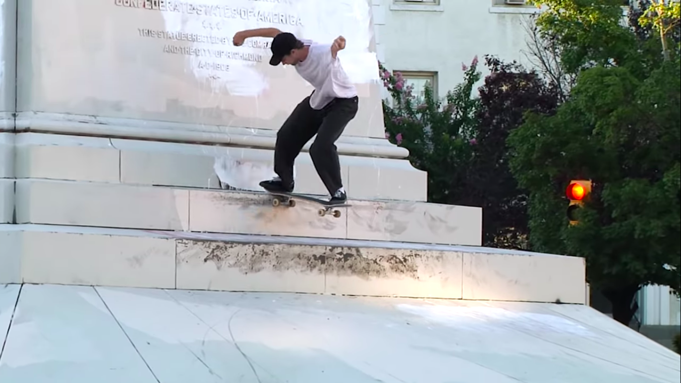 Obviously there are limitations to the youthful archetype’s ability to address the breadth of the pandemic: when McNeely presses a frontside noseslide to fakie on the vandalized pedestal of Richmond’s statue of Confederate General J.E.B. Stuart, the clip feels dangerously ahistorical, taking for granted the protests and public pressure that lead to the monument’s removal, and which only incidentally freed up the space for skaters, as well. Yet, and I know this is a stretch, the videomaker’s decision to crop out the statue itself makes me give them the benefit of the doubt that they are aware of its racist legacy (otherwise, guys, I have questions about why you included it...).